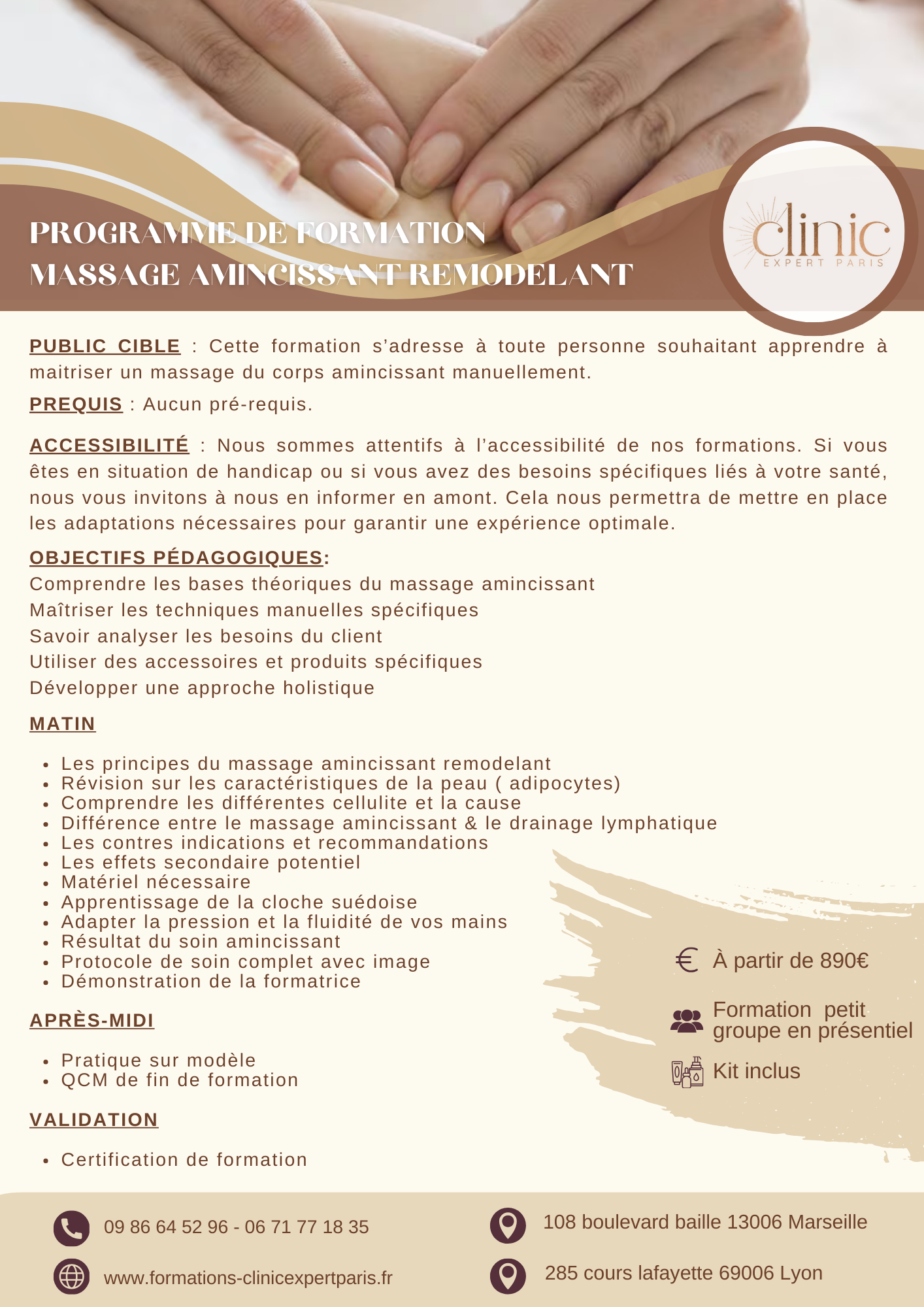 Cette formation permet d’apprendre à réaliser un massage amincissant remodelant manuel complet et à travailler sur des zones plus disgracieuses telles que les cuisses, le ventre, les fesses, les hanches et les bras. Vous apprendrez la bonne posture et à vous focaliser sur la précision des gestes, car le massage doit être fluide tout en étant suffisamment appuyé pour être efficace pour vos futurs clients.